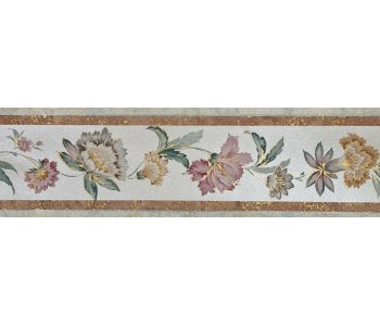 The border consists of a central band featuring a series of large, stylized flowers with leaves, all rendered in soft pastel colours such as pink, green, gold, grey, light brwon and beige.