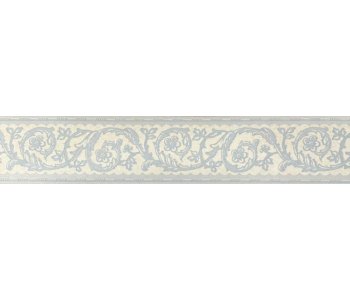 19 Metres 212423 Coloroll Sscroll Leaf Design Border is a high-quality wallpaper border featuring a leaf pattern in shades of pale yellow and pale blue.