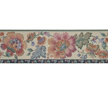 The image depicts a decorative floral border, likely intended for wallpaper or similar uses. The design features a series of stylized, colourful flowers and leaves arranged in a horizontal pattern. The flowers are large and intricate, with a variety of shapes and petal arrangements, creating a lively and ornate appearance.