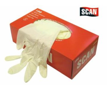 Scan Disposable Latex Gloves are lightly powdered inside to absorb moisture, keeping hands dry and sweat-free. The gloves are ambidextrous, meaning that any glove will fit either left or right hands. They are non-sterile.